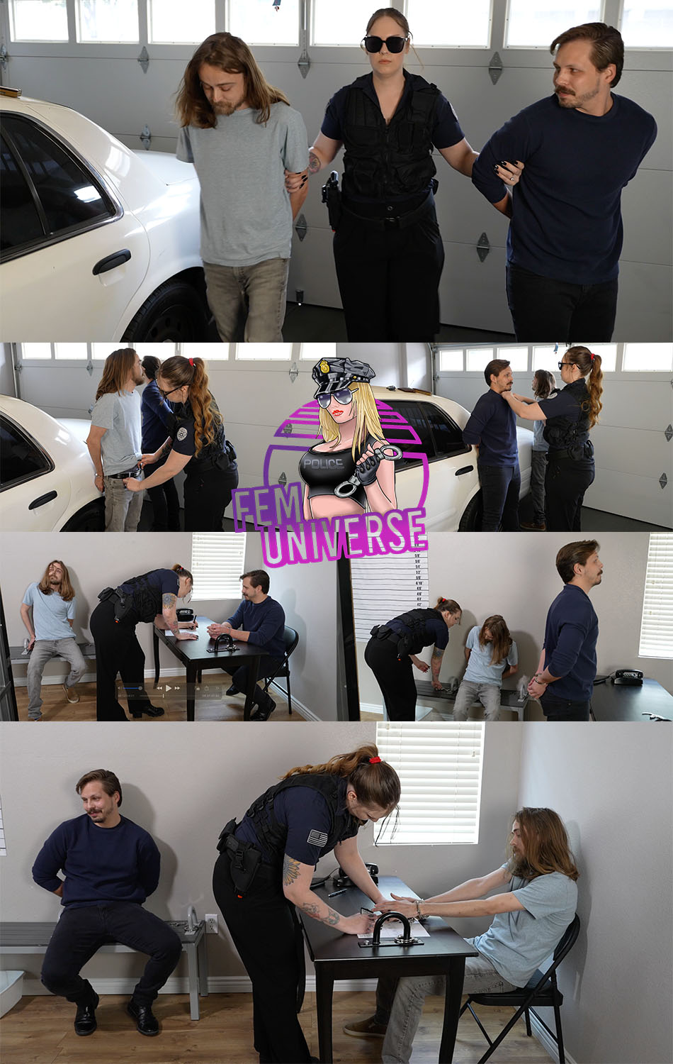 Officer Heather brings the two perps into the station and cuffs Oliver to the bench. She walks Damon to the interrogation table and switches his handcuffs to the front and cuffs him to the table. She fills out his paperwork and removes his cuffs from the table, switching them to behind his back again. She leads him back over to the bench where she uncuffs Oliver and they switch places and she cuffs Damon to the bench. She now switches Oliver’s cuffs to the front and has him sit at the interrogation table. She cuffs him to it and fills out his paperwork to be booked and asks him questions. She removes his cuffs and switches them to the front and takes him to the mugshot board where she makes him take his shoes off and she takes his mugshot. She has him sit on the bench and pulls Damon. He takes his shoes off and has his mugshots taken. Officer Heather then leads them both to the cell and locks them in.